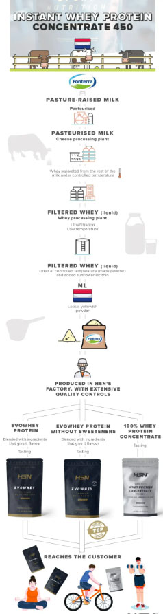 As we have seen throughout this article, the raw material used in HSN products, Evowhey Protein and 100% Whey Protein Concentrate, the iWPC 450 manufactured by Fonterra at their facilities in the Netherlands, is practically the Gold Standard of the industry: a protein with exceptional nutritional values and organoleptic properties.