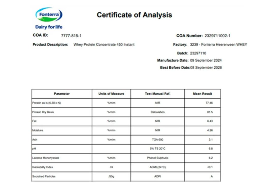Here, we explain the characteristics and why we have chosen Fonterra as our raw material and its excellence in dairy protein production, offering: