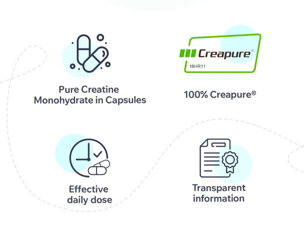 - 100% Pure Creapure® Creatine Monohydrate in vegetable capsules.